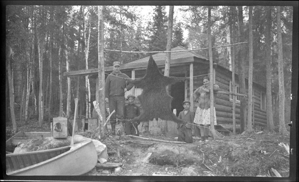 Trappeur et sa famille avec une peau d'ours à Kipawa