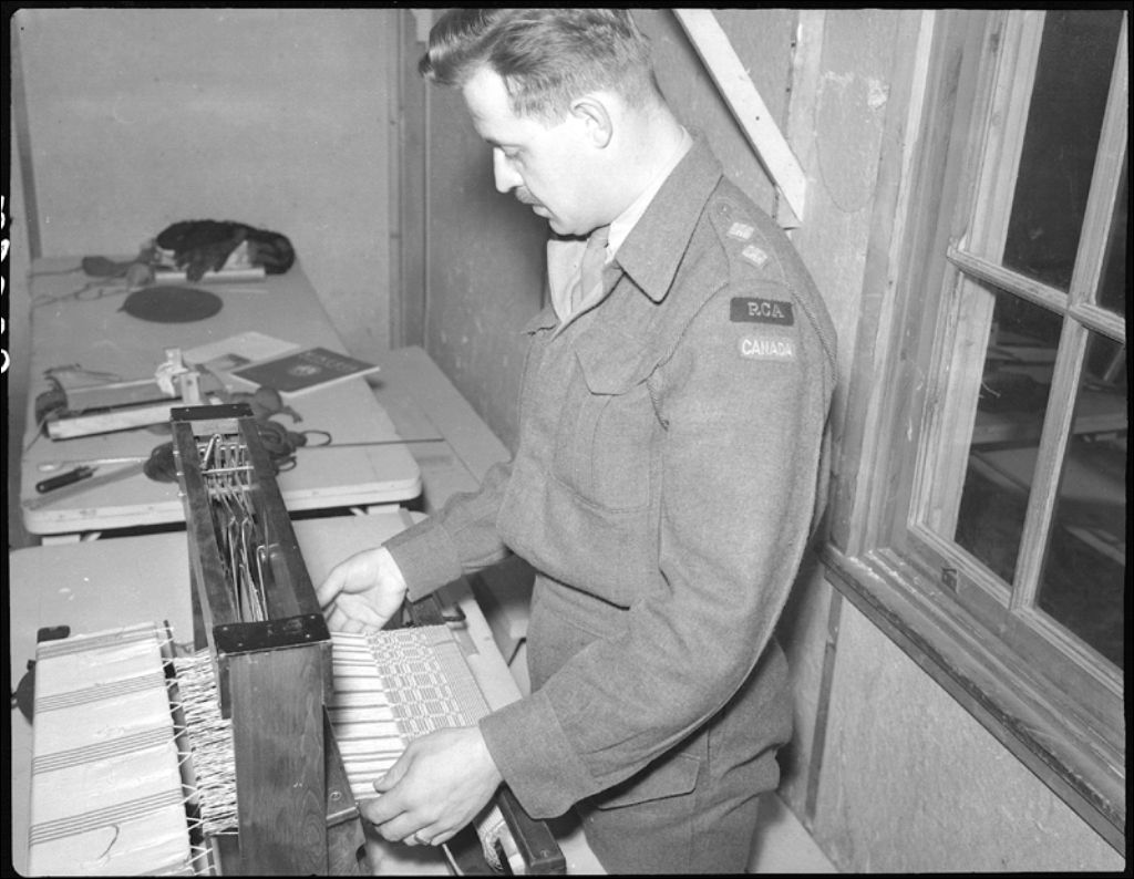 Le lieutenant A. Dubreuil au métier à tisser à Valcartier, 1945, Archives nationales à Québec, Fonds Ministère de la Culture et des Communications, (03Q,E6,S7,SS1,D2,P28568), Neuville Bazin.