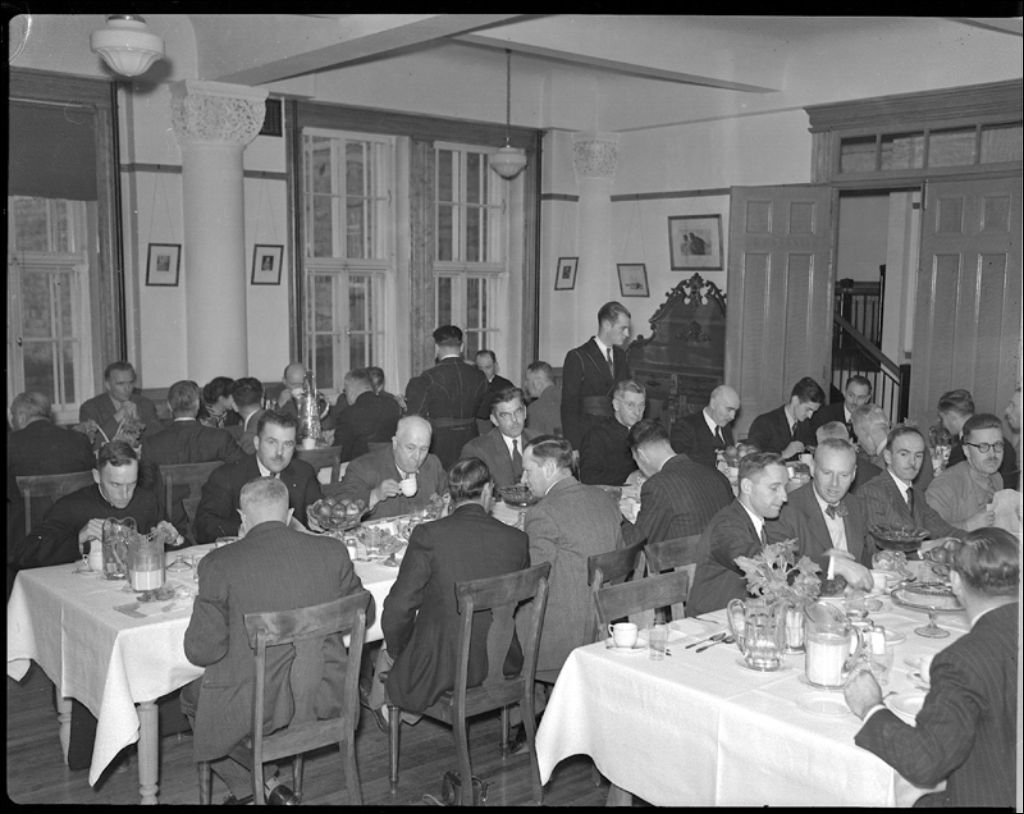 Visite des délégués de la conférence des vivres, diner au collège de Sainte-Anne-de-la-Pocatière, 1945, Archives nationales à Québec, Fonds Ministère de la Culture et des Communications, (03Q,E6,S7,SS1,D2,P28891), Neuville Bazin.