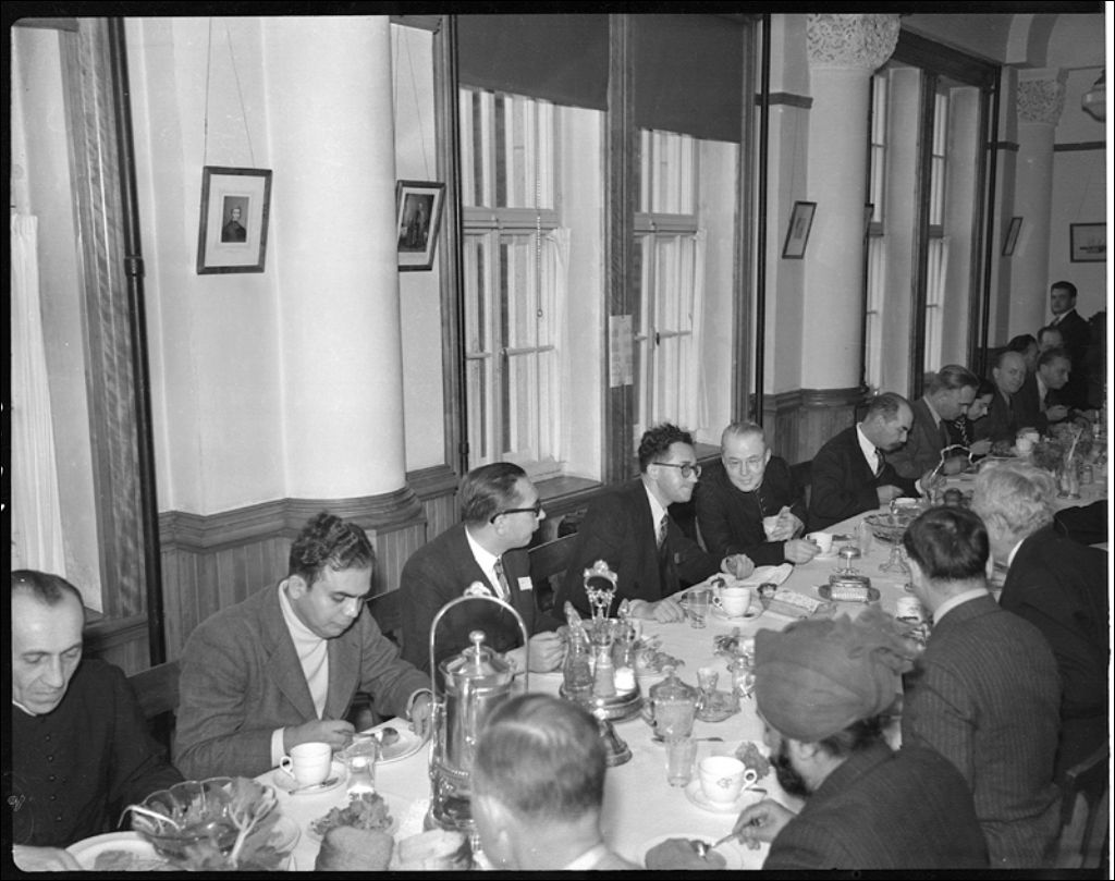 Visite des délégués de la conférence des vivres, diner au collège de Sainte-Anne-de-la-Pocatière, 1945, Archives nationales à Québec, Fonds Ministère de la Culture et des Communications, (03Q,E6,S7,SS1,D2,P28893), Neuville Bazin.