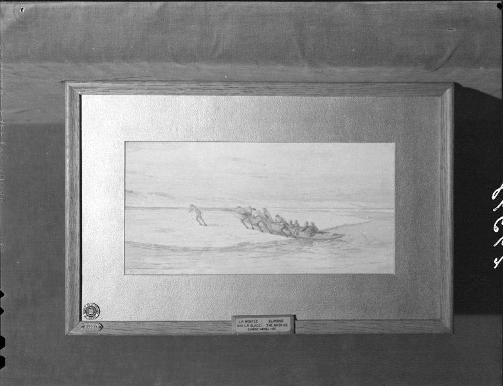 Peinture: «La traversée du fleuve en hiver à Québec, 1910» par Eugène Hamel, 1945, Archives nationales à Québec, Fonds Ministère de la Culture et des Communications, (03Q,E6,S7,SS1,D2,P29398), Neuville Bazin.