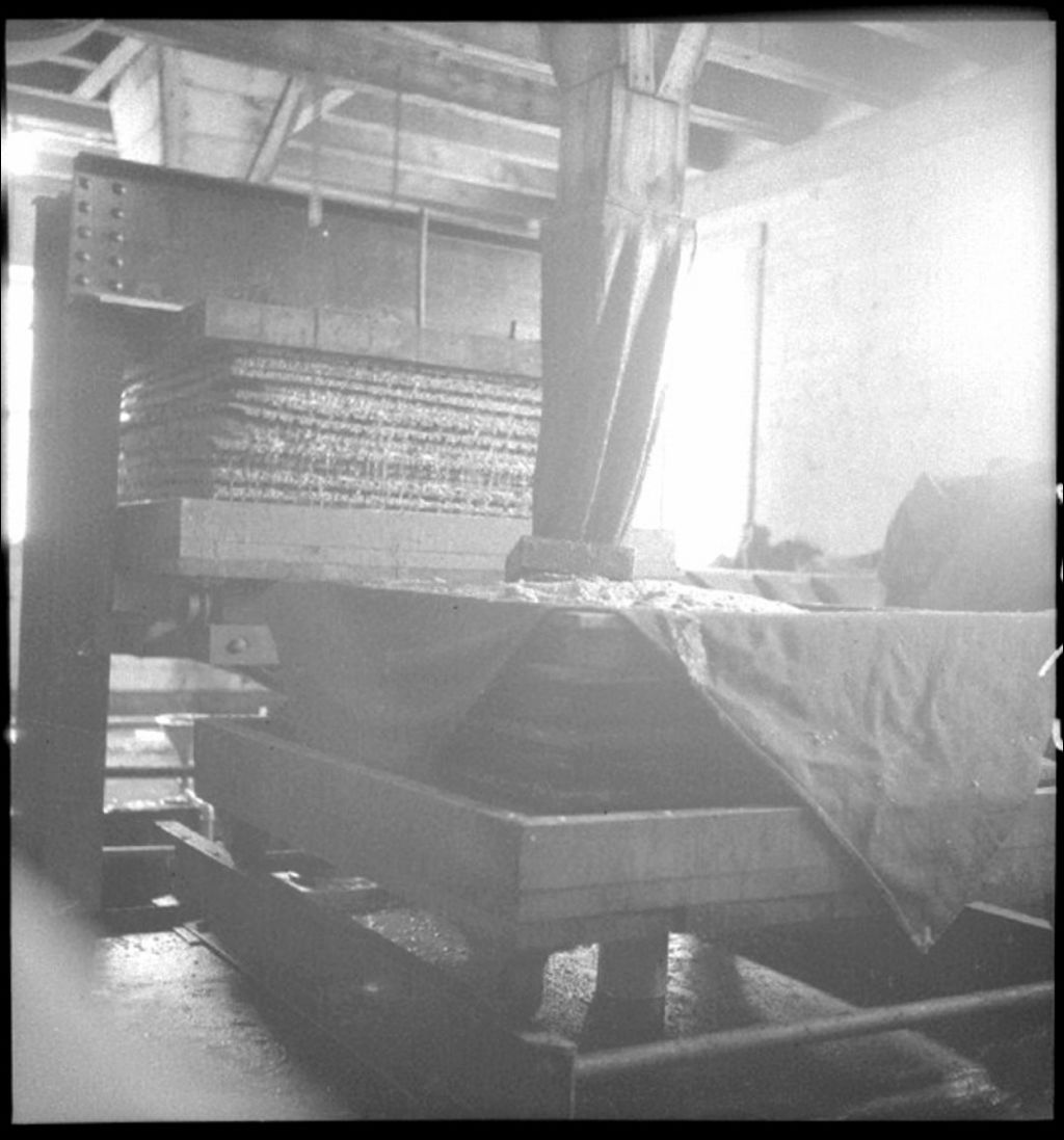 Pressoir hydraulique, coopérative montégérienne à Rougemont, 1941, Archives nationales à Québec, Fonds Ministère de la Culture et des Communications, (03Q,E6,S7,SS1,D2,P2963), Maurice Lessard.