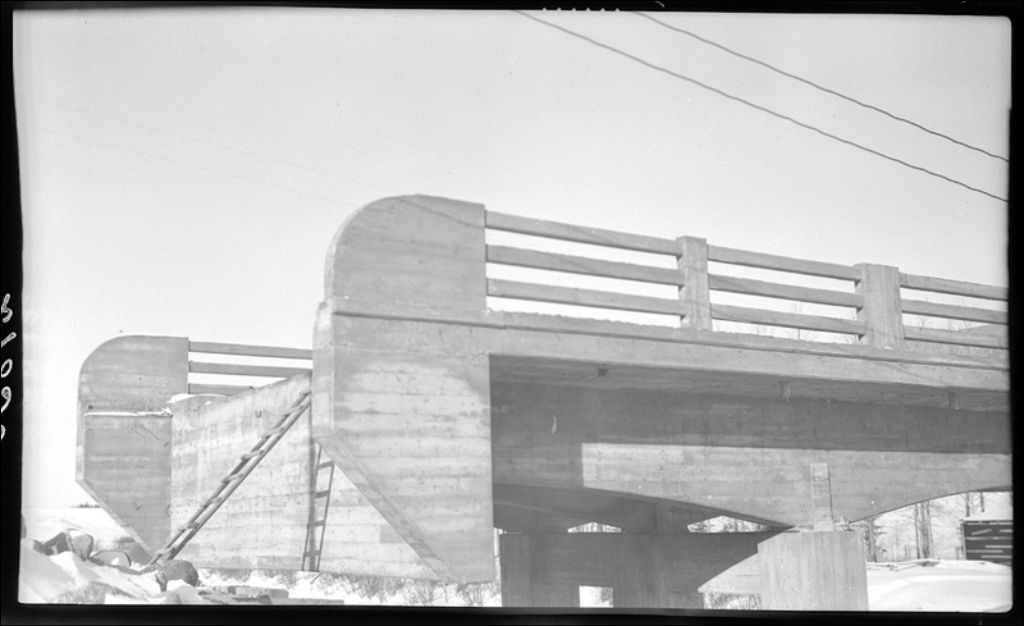 Pont du village sur la rivière Noire à Sainte-Jeanne-d'Arc, comté de Roberval, 1946, Archives nationales à Québec, Fonds Ministère de la Culture et des Communications, (03Q,E6,S7,SS1,D2,P29850), J. Cournoyer.