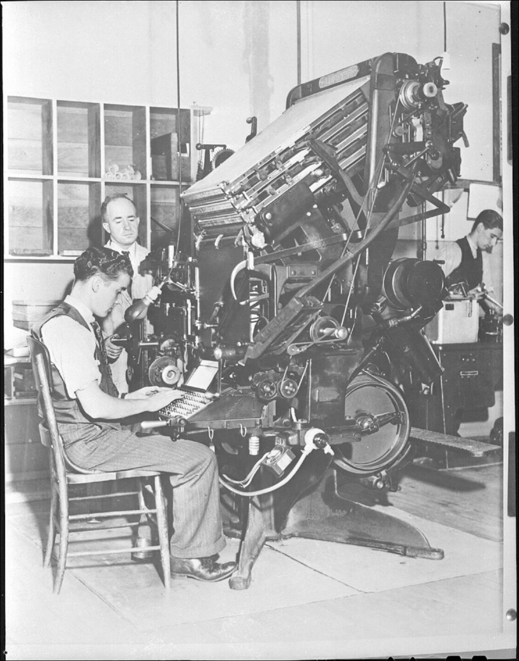 Monotype, composition mécanique, à l'École des Arts et Métiers de Verdun, 1946, Archives nationales à Québec, Fonds Ministère de la Culture et des Communications, (03Q,E6,S7,SS1,D2,P30210), Paul Carpentier.
