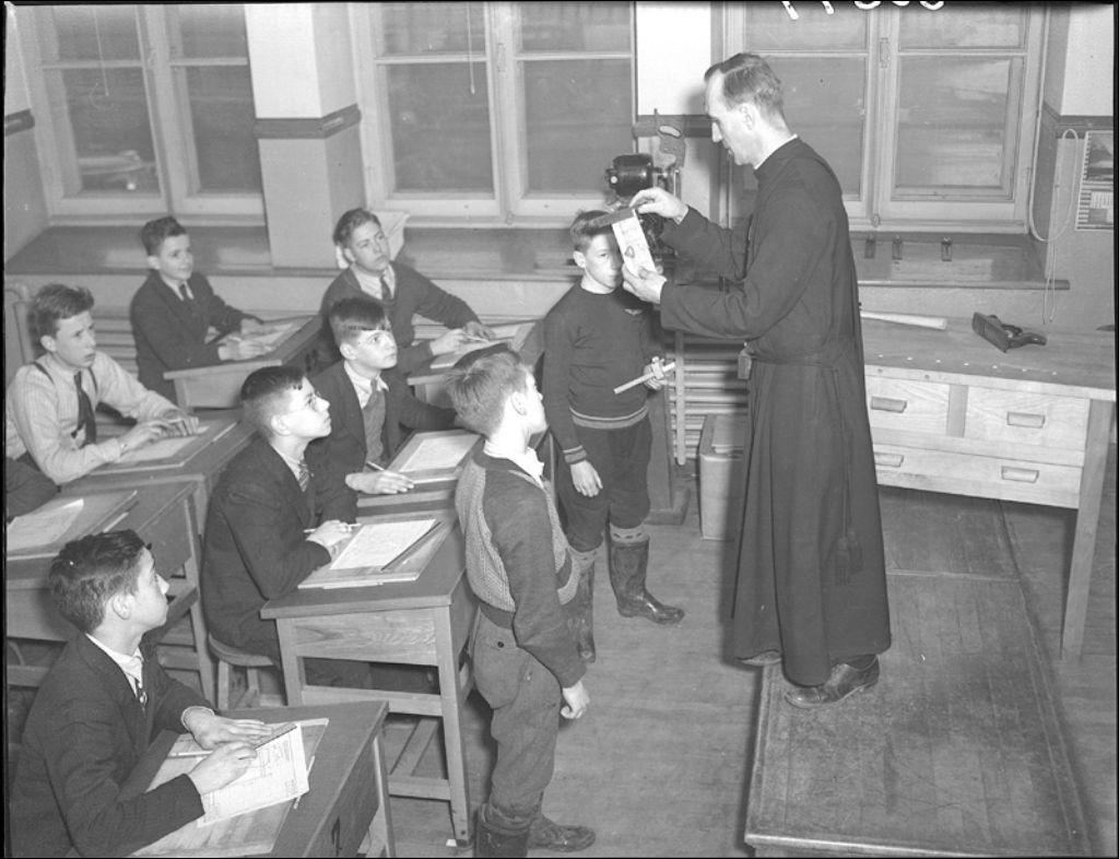 Démonstration du frère Georgius dans la classe de dessin à l'école Saint-Charles de Limoilou à Québec