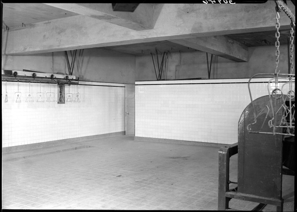 Intérieur du poste d'abattage de volailles de la coopérative fédérée de Québec Ouest, 1946, Archives nationales à Québec, Fonds Ministère de la Culture et des Communications, (03Q,E6,S7,SS1,D2,P30946), Neuville Bazin.