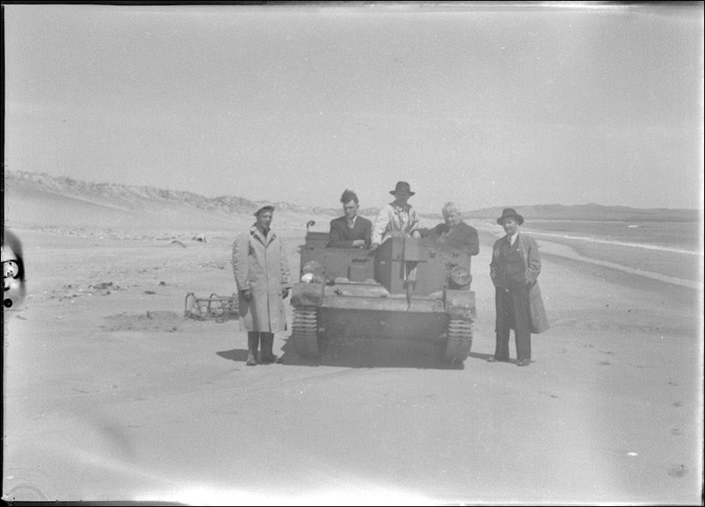 Mission d'étude de la voirie autour du "Bren Carrier" aux îles de la Madeleine, 1944, Archives nationales à Québec, Fonds Ministère de la Culture et des Communications, (03Q,E6,S7,SS1,D2,P30989), G. Piette.