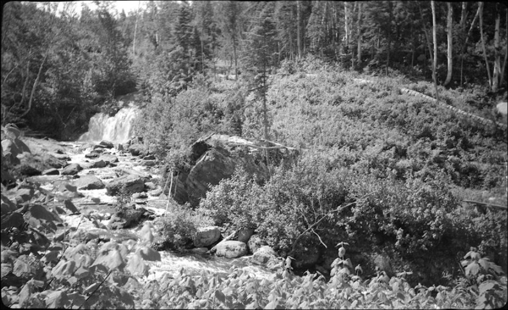 Le moulin à scie et les chutes à l'embouchure de la rivière Dorval à Saint-Gérard, comté de Lac-Saint-Jean, 1946, Archives nationales à Québec, Fonds Ministère de la Culture et des Communications, (03Q,E6,S7,SS1,D2,P31352), Charles-Edmond Deslauriers.