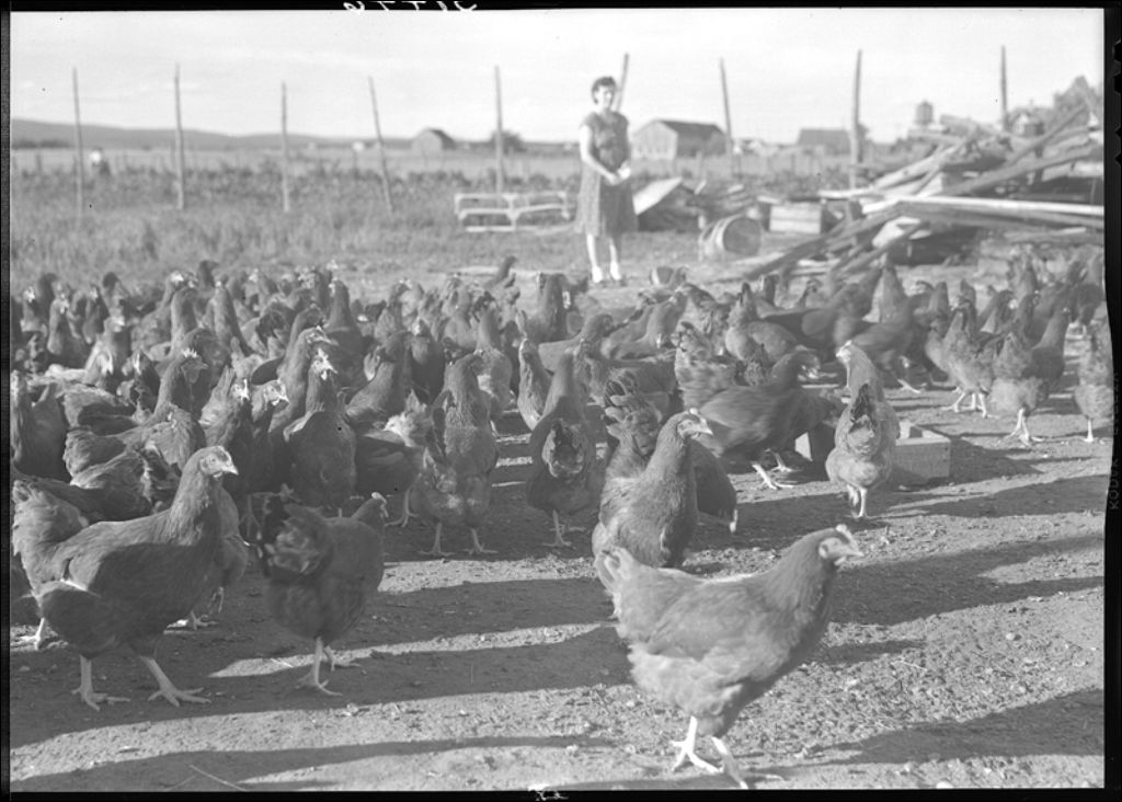 Poulettes Rhode Island à Saint-Alban, comté de Portneuf, 1946, Archives nationales à Québec, Fonds Ministère de la Culture et des Communications, (03Q,E6,S7,SS1,D2,P31446), J.W. Michaud.