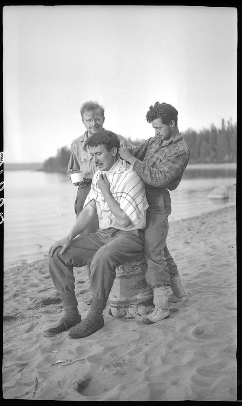Hair cut; seated Jacques Claveau, standing Frank Russell and left, Paul Grenier