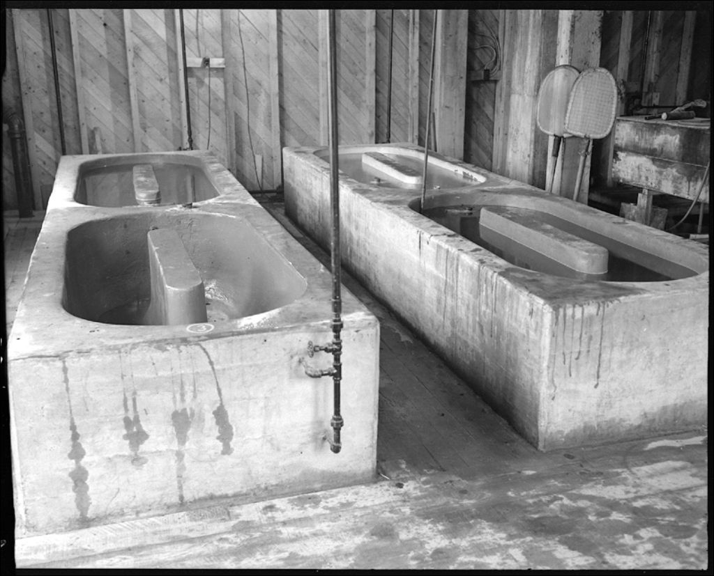 Bassins pour expériences sur les larves de homard, école de biologie, Grande-Rivière, Gaspé, 1945, Archives nationales à Québec, Fonds Ministère de la Culture et des Communications, (03Q,E6,S7,SS1,D2,P32268), Paul Carpentier.