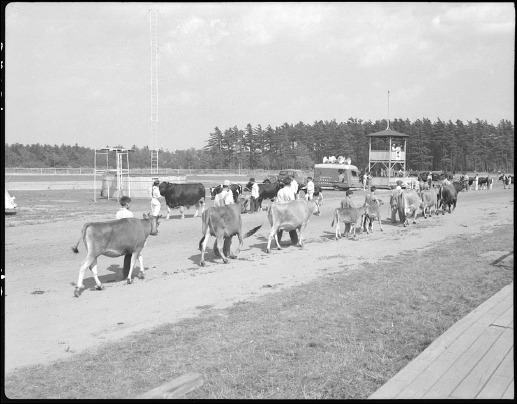 Parade et jugement d'animaux à l'exposition provinciale de 1946 à Saint-Hyacinthe, 1946, Archives nationales à Québec, Fonds Ministère de la Culture et des Communications, (03Q,E6,S7,SS1,D2,P32339), Paul Carpentier.