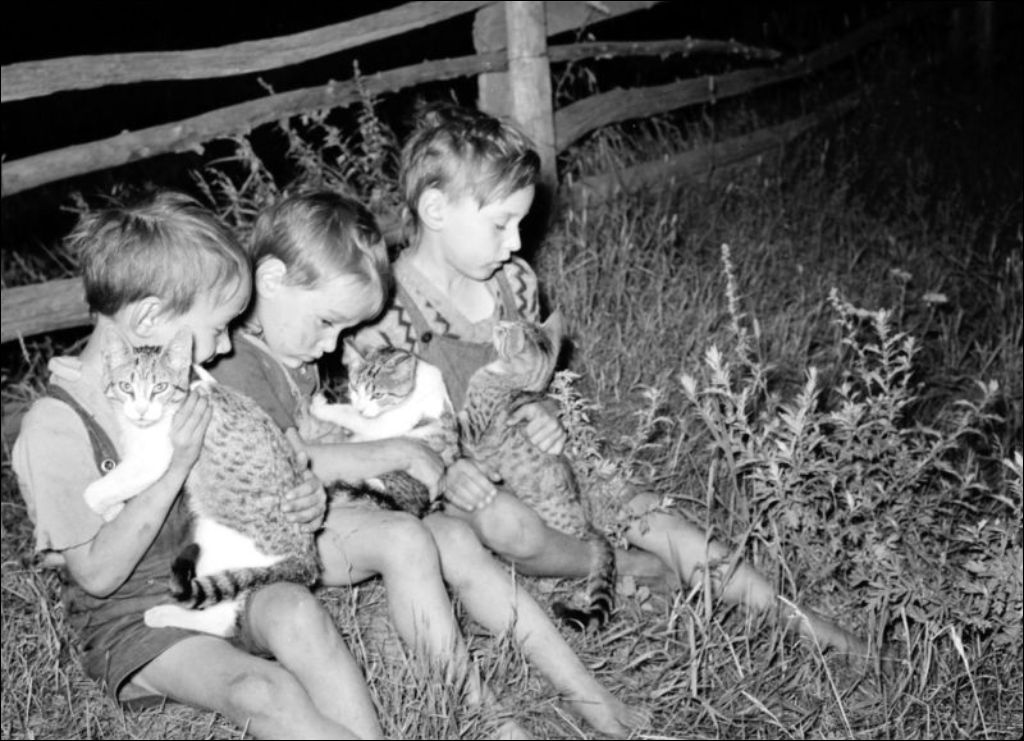 Enfants avec des chats sur la ferme de Wilfrid Berthier (ou Bernier?) à Saint-Charles, comté de Bellechasse, 1946, Archives nationales à Québec, Fonds Ministère de la Culture et des Communications, (03Q,E6,S7,SS1,D2,P32807), J.W. Michaud.