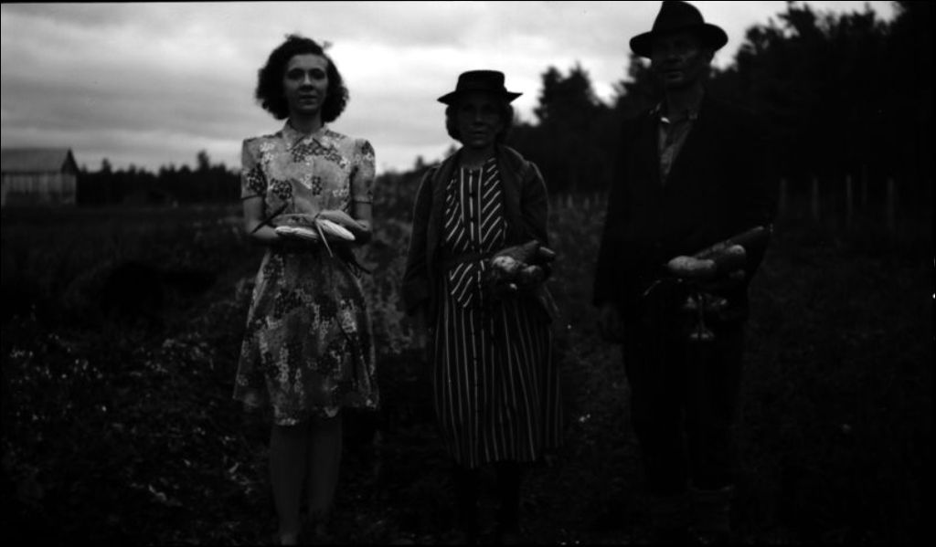 M. Thibodeau, médaillé de bronze au mérite agricole des colons, sa femme et sa fille dans leur jardin à Saint-Gédéon-de-Beauce