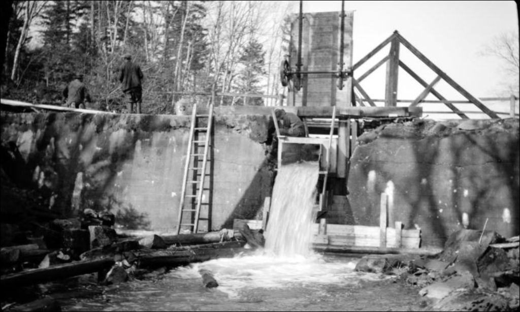 Barrage sur la décharge du lac Sept-Îles, comté de Portneuf, 1946, Archives nationales à Québec, Fonds Ministère de la Culture et des Communications, (03Q,E6,S7,SS1,D2,P34202), Charles-Edmond Deslauriers.