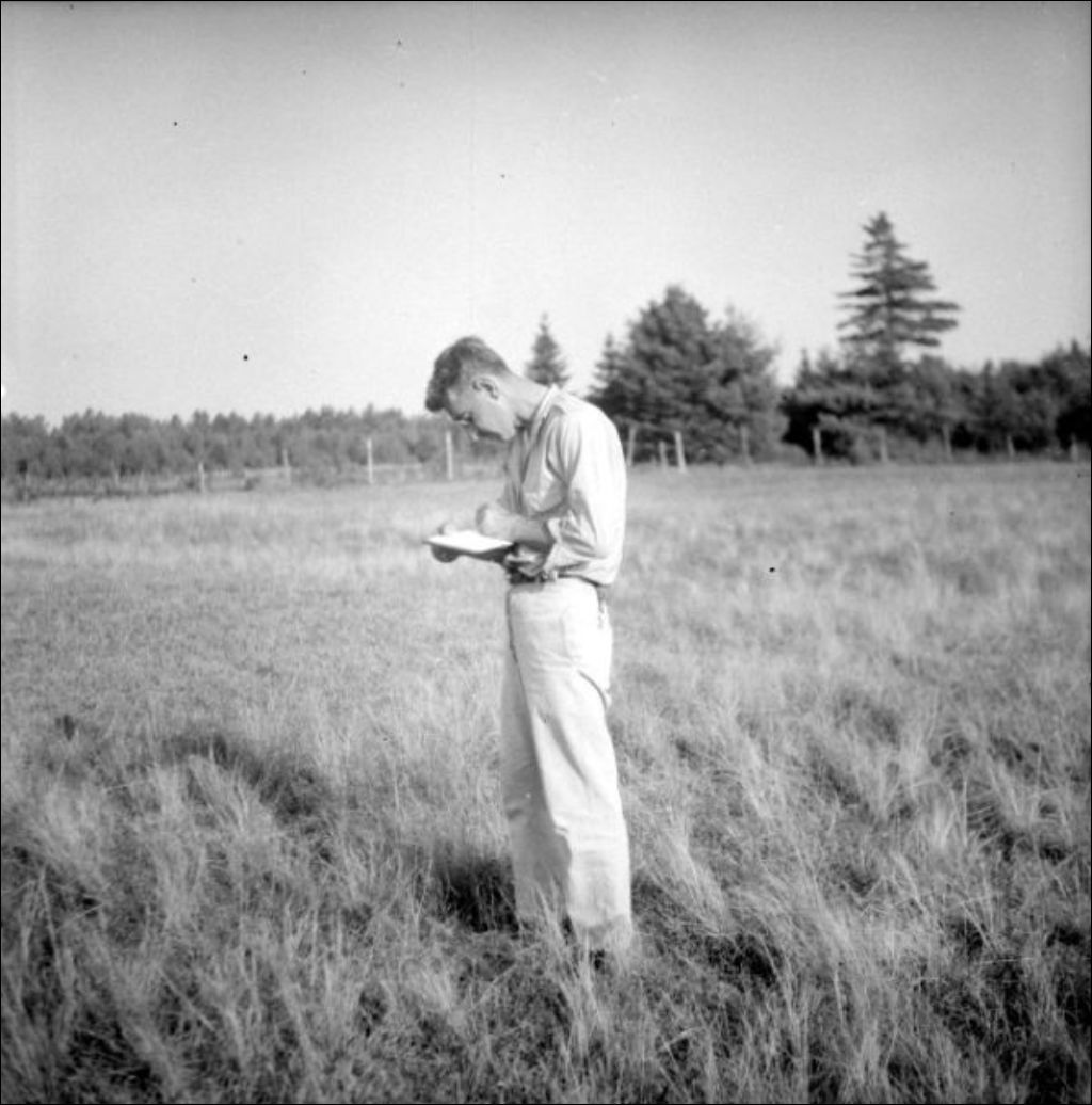 Végétation sur limon sableux à Notre-Dame-de-Pierreville, comté de Yamaska. M. Léonidas Verret faisant un relevé de la végétation, 1946, Archives nationales à Québec, Fonds Ministère de la Culture et des Communications, (03Q,E6,S7,SS1,D2,P34336), L. Choinière.