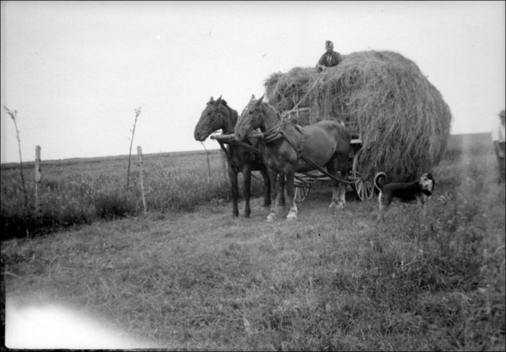 Charge de foin à Baie-du-Fèbvre, 1946, Archives nationales à Québec, Fonds Ministère de la Culture et des Communications, (03Q,E6,S7,SS1,D2,P34863), Y. Parent.