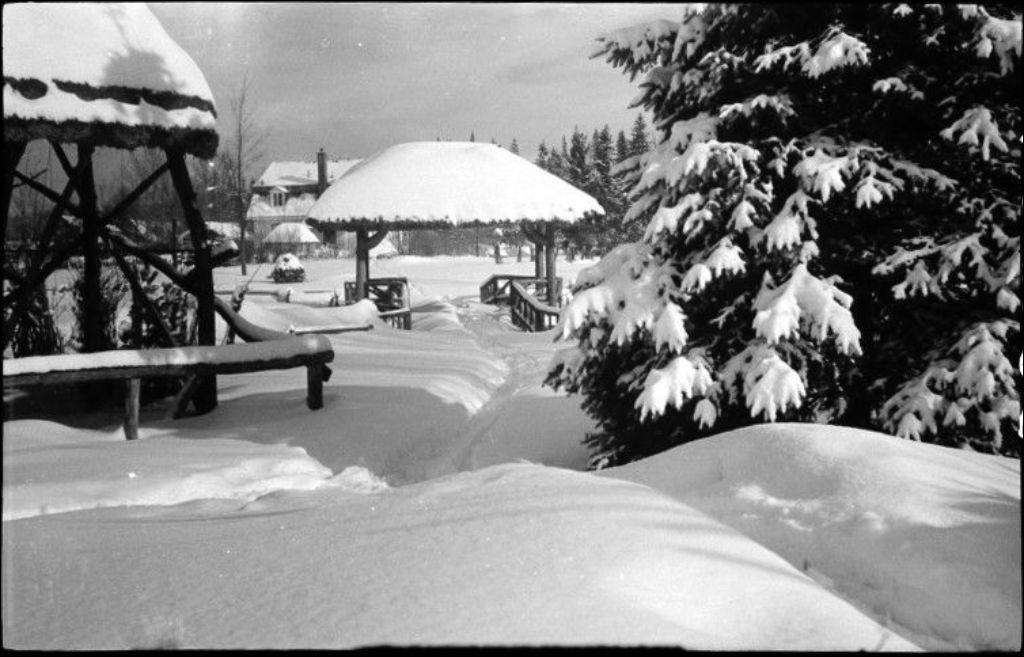 Kiosque sur la rivière Duberger au jardin zoologique de Québec, 1947, Archives nationales à Québec, Fonds Ministère de la Culture et des Communications, (03Q,E6,S7,SS1,D2,P35224), Raymond Cayouette.
