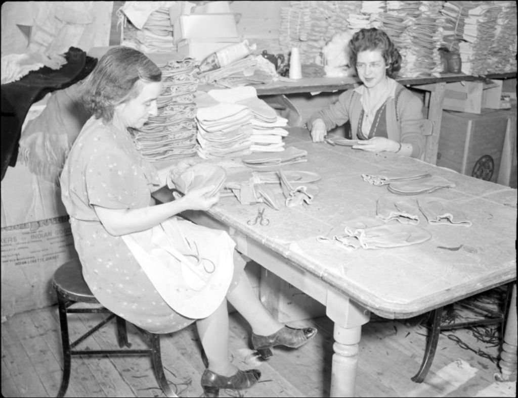 Fabrication de mitaines de cuir à la manufacture de Bastien Bros. au Village-Huron