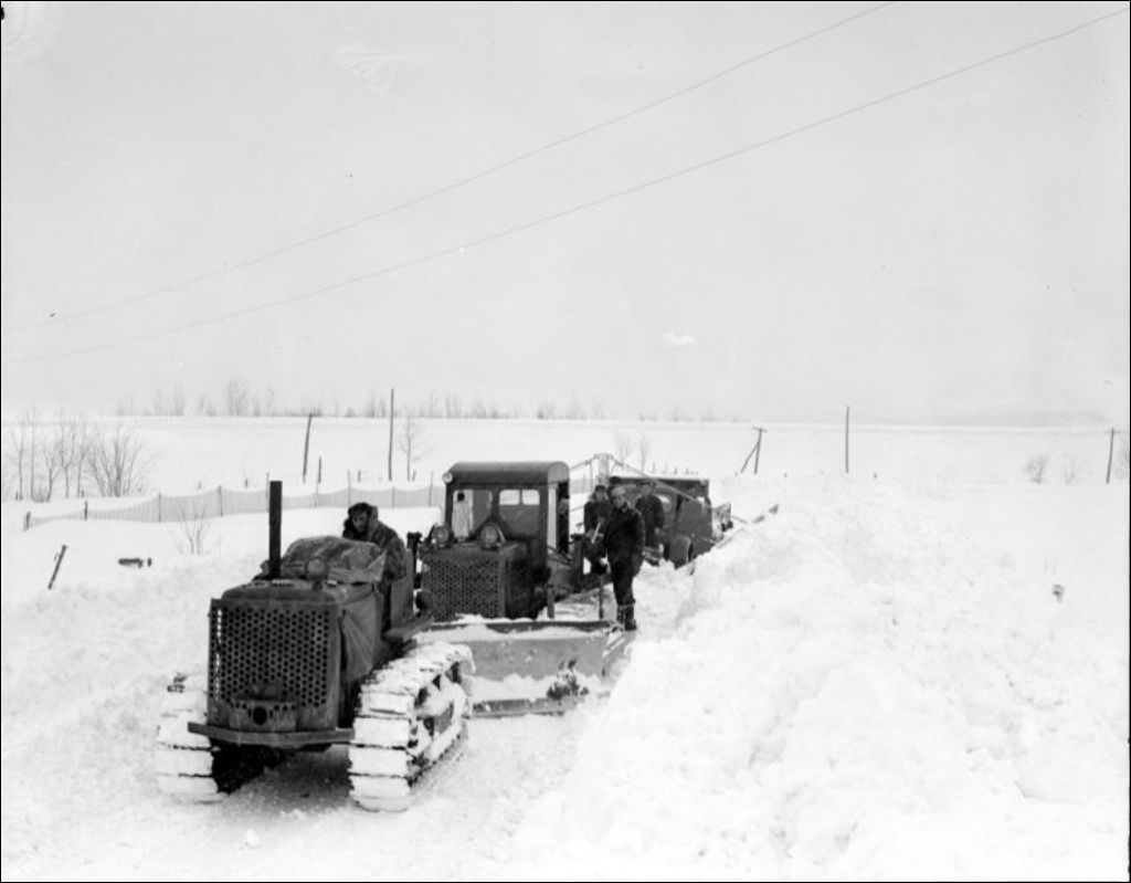Établissement Durette et Guérette: Déblayage d'une route forestière à Estcourt, comté de Témiscouata, 1947, Archives nationales à Québec, Fonds Ministère de la Culture et des Communications, (03Q,E6,S7,SS1,D2,P35477), J.W. Michaud.