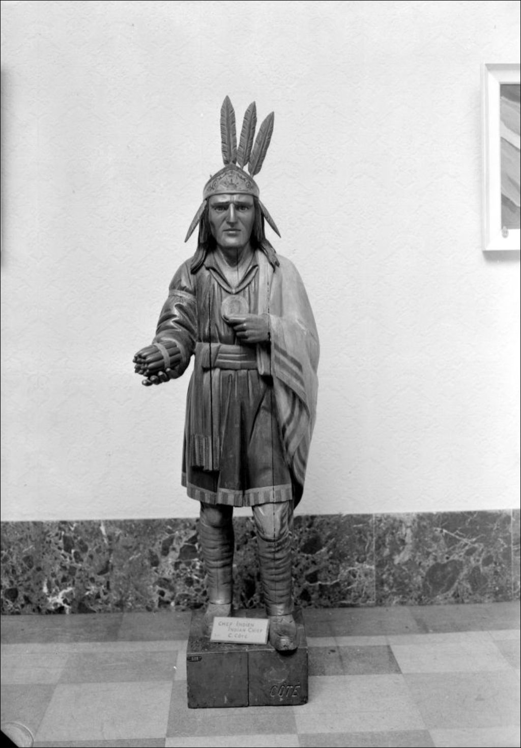 «Chef Indien», sculpture par Côté, 1947, Archives nationales à Québec, Fonds Ministère de la Culture et des Communications, (03Q,E6,S7,SS1,D2,P35521), Roland Charuest.