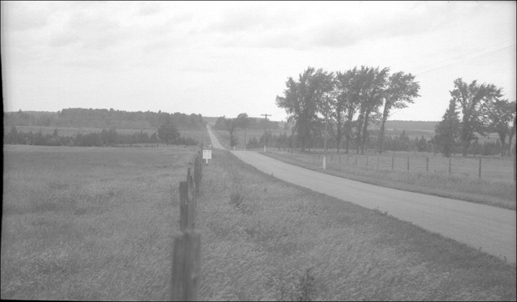 Vue du terrain prise du haut du «plank road» à Sainte-Barbe, comté de Huntingdon, 1942, Archives nationales à Québec, Fonds Ministère de la Culture et des Communications, (03Q,E6,S7,SS1,D2,P3618), W. Dubé.