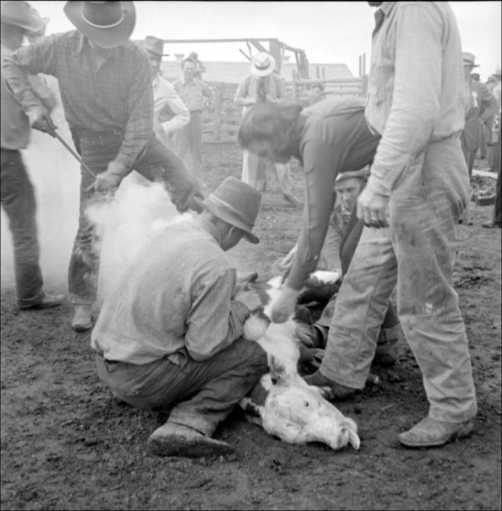 Marquage des animaux au McIntyre Ranch en Alberta, 1947, Archives nationales à Québec, Fonds Ministère de la Culture et des Communications, (03Q,E6,S7,SS1,D2,P36921), Auguste Scott.