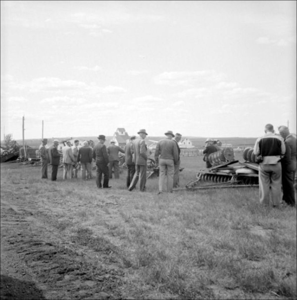 Groupe de congressistes de l'Agricultural INstitute of Canada examinant différentes machineries à la ferme expérimentale de Swift-Current en Alberta