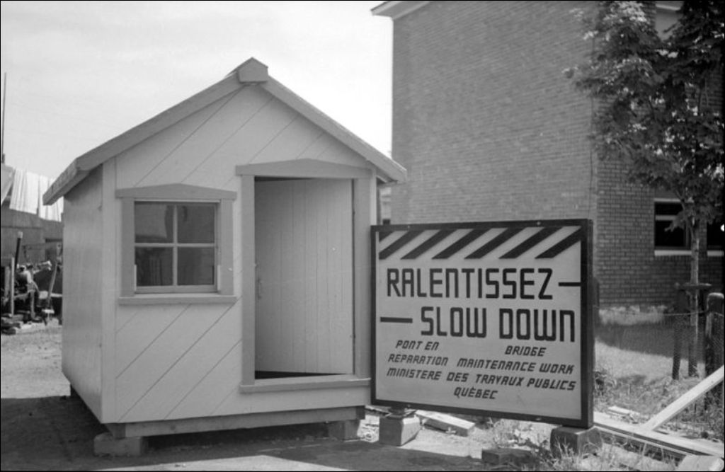 Maisonnette à outillage avec un affichage type à Saint-Narcisse, comté de Champlain, 1947, Archives nationales à Québec, Fonds Ministère de la Culture et des Communications, (03Q,E6,S7,SS1,D2,P37111), T.M. Dechêne.