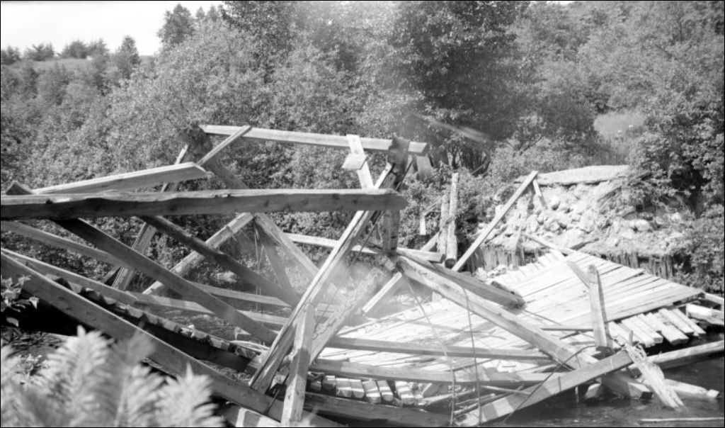 Pont sur la rivière à l'Ours à Saint-Prime, comté de Roberval, 1947, Archives nationales à Québec, Fonds Ministère de la Culture et des Communications, (03Q,E6,S7,SS1,D2,P37133), J. Cournoyer.