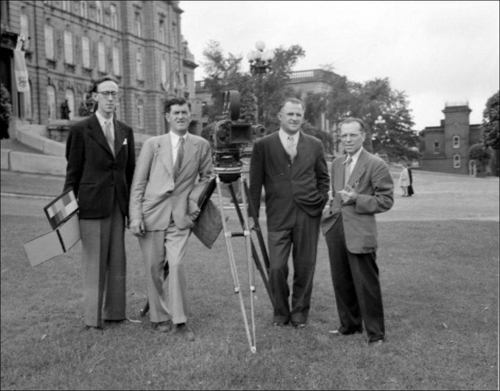 Michel Vergnes [et Jos Morin] de Ciné -Photo et des cinéastes de la Fox Movieland à Québec, 1947, Archives nationales à Québec, Fonds Ministère de la Culture et des Communications, (03Q,E6,S7,SS1,D2,P37331), J.W. Michaud.