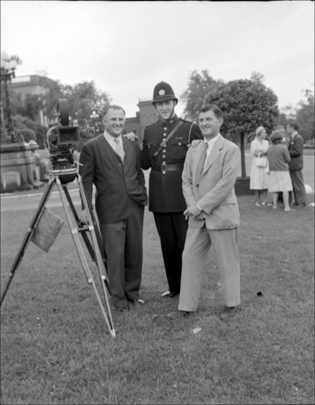 Un officier de la Police provinciale et les reporters de Fox News à Québec, 1947, Archives nationales à Québec, Fonds Ministère de la Culture et des Communications, (03Q,E6,S7,SS1,D2,P37333), J.W. Michaud.