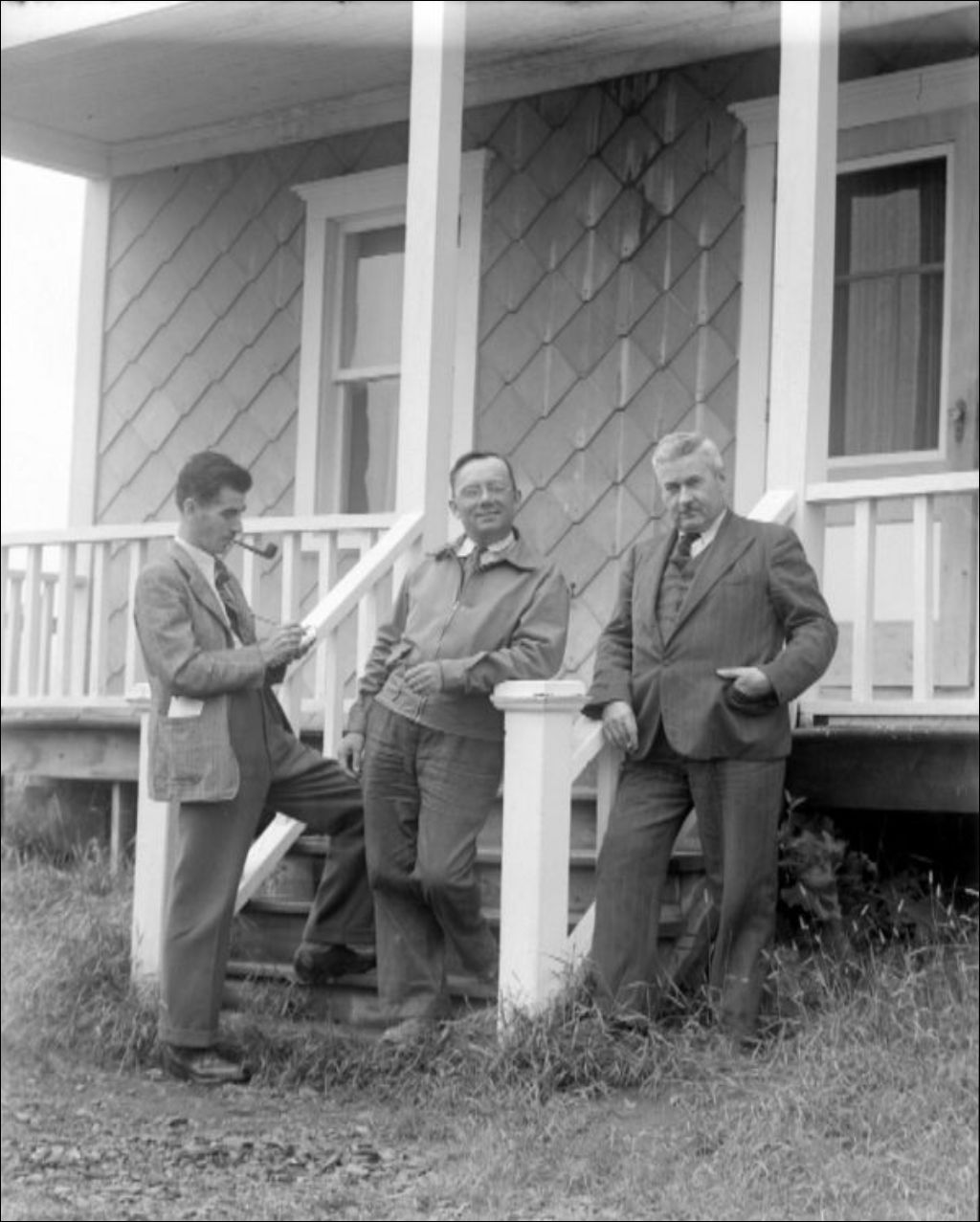 La colonie de Grande-Vallée, Gaspé Nord. MM. J.B. Roy et C.A. Dorion interviewant M. Alfred Lamy, 1947, Archives nationales à Québec, Fonds Ministère de la Culture et des Communications, (03Q,E6,S7,SS1,D2,P37671), Omer Beaudoin.