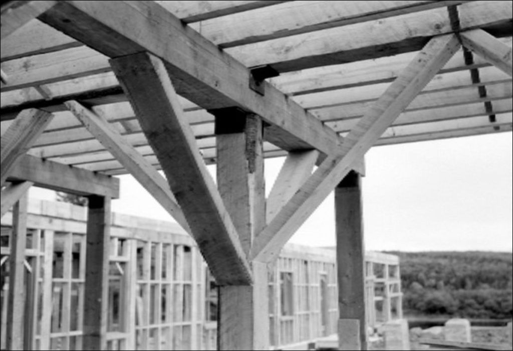 Colonnes et supports de poutres lors de la construction du moulin à l'école de Duchesnay