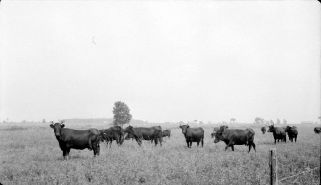 Troupeau de vaches, propriété de J.P. Beaudry à Saint-Marc-de-Cournoyer, 1947, Archives nationales à Québec, Fonds Ministère de la Culture et des Communications, (03Q,E6,S7,SS1,D2,P38536), J.R. Fournier.