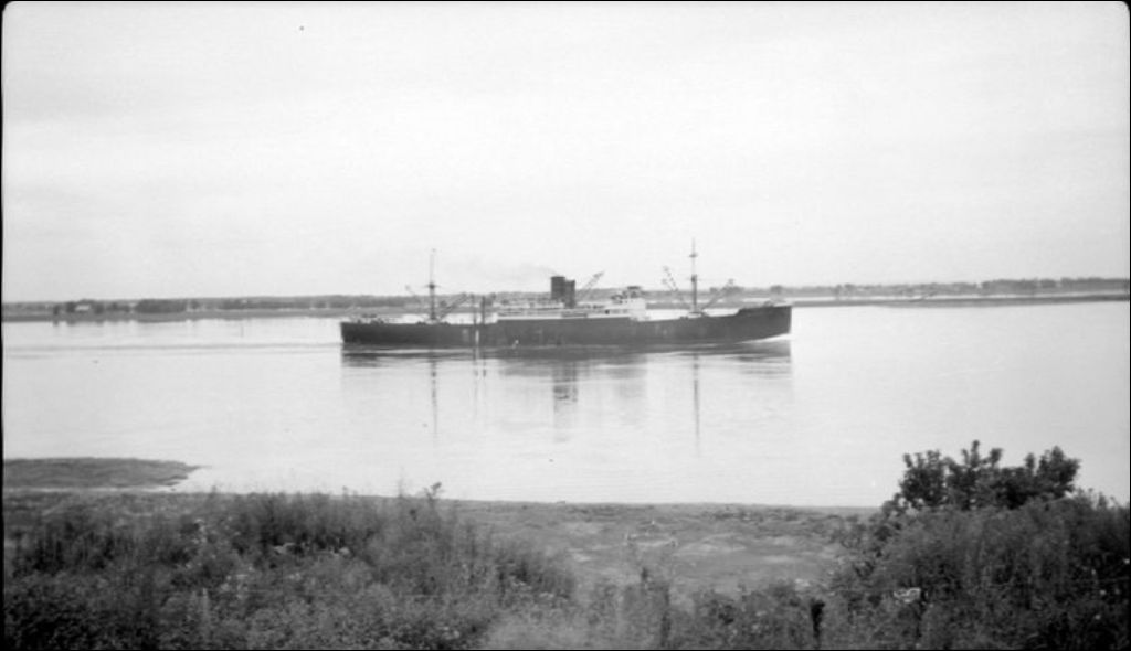 Le «Manchester Port» longeant le rivage du fleuve Saint-Laurent à Verchères, 1947, Archives nationales à Québec, Fonds Ministère de la Culture et des Communications, (03Q,E6,S7,SS1,D2,P38563), J.R. Fournier.