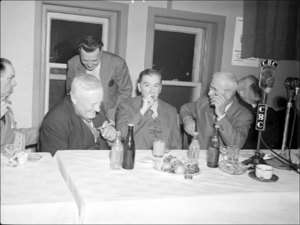 M. J.A. Rhéault de Deschaillons, récipiendaire du Mérite agricole, Maurice Duplessis, Laurent Barré et Alexandre RIoux (debout) au banquet du Mérite agricole à Québec