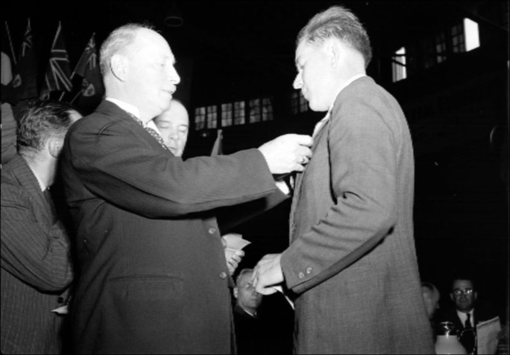 L'Honorable A. Paquet remet une décoration à un lauréat au Colisée de Québec