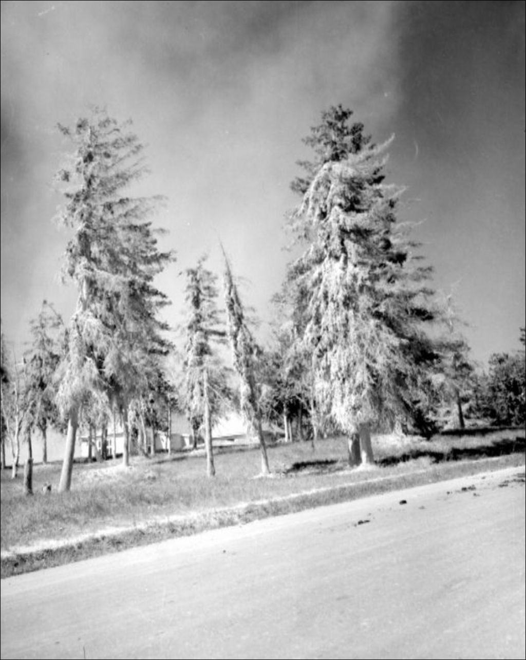 Épinettes recouvertes de poussière d'amiante à East Broughton, 1947, Archives nationales à Québec, Fonds Ministère de la Culture et des Communications, (03Q,E6,S7,SS1,D2,P38805), J.W. Michaud.