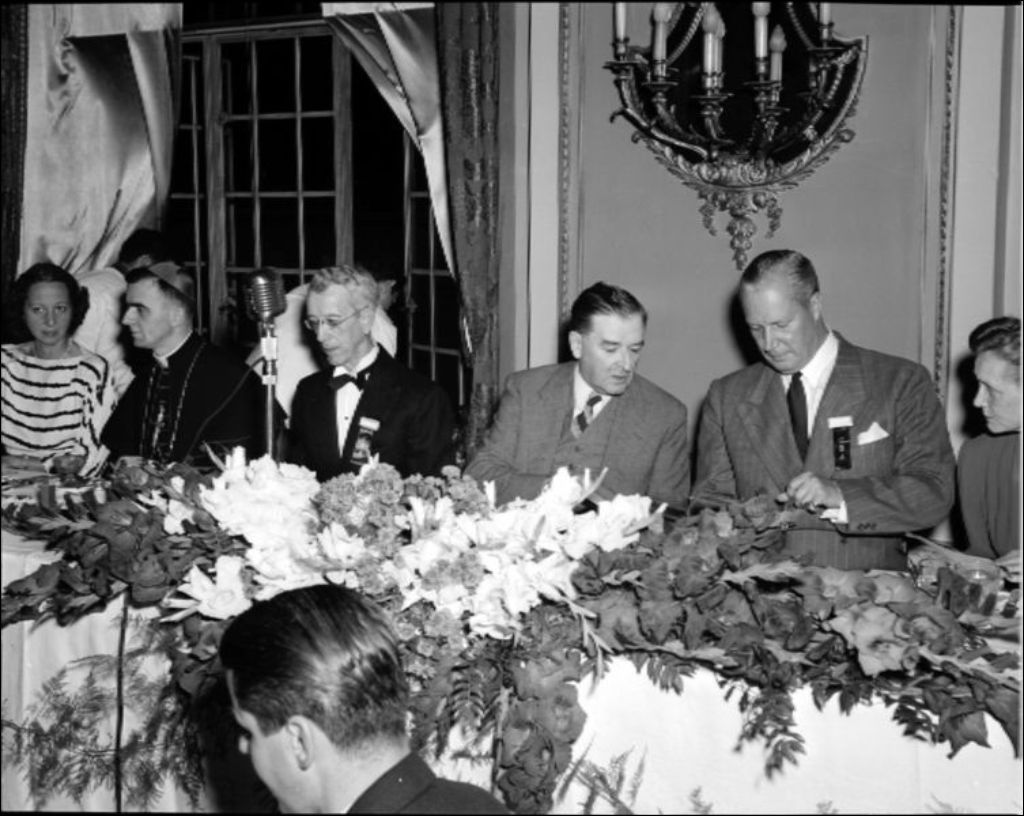 L'Honorable Maurice Duplessis, Georges Drew et B.O. Filteau au congrès de l'Association canadienne d'éducation au Château Frontenac à Québec