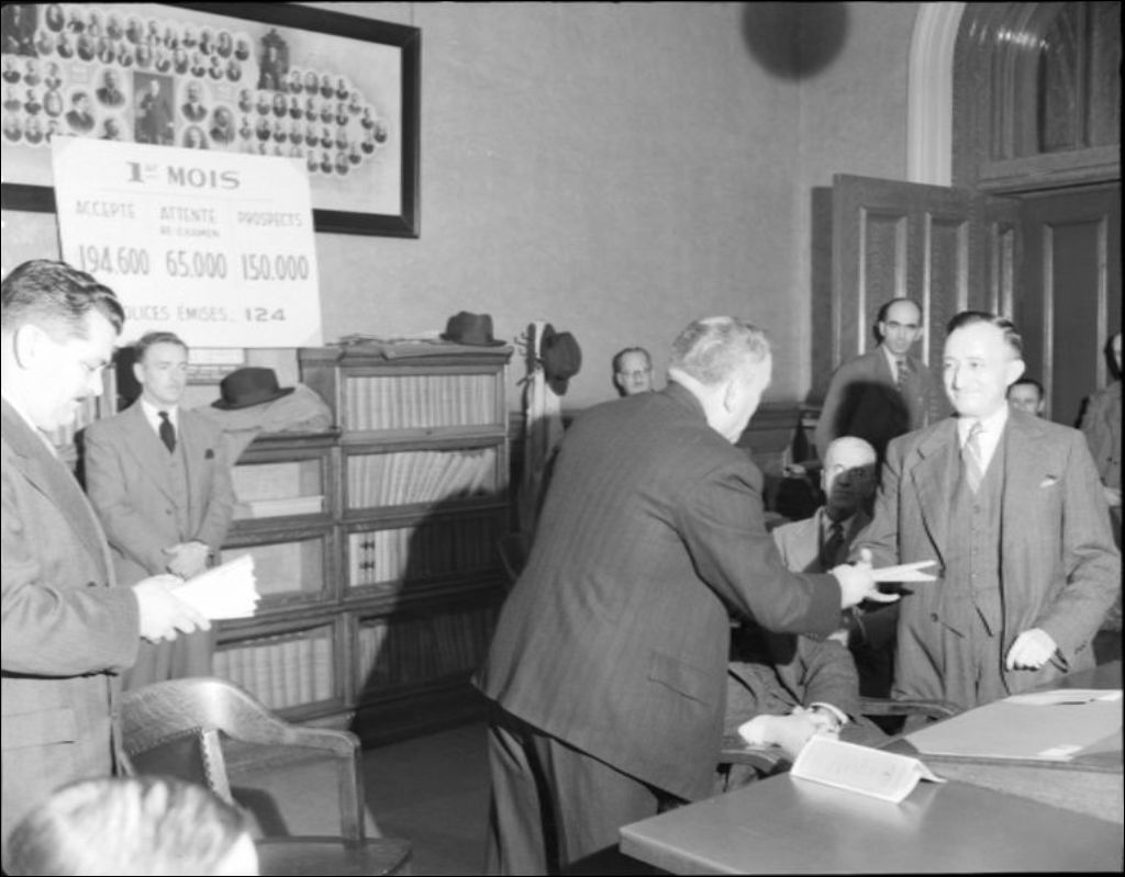 MM. Gagnon et Barré remettent la première police d'assurance de l'Assurance mutuelle des employés civils., 1947, Archives nationales à Québec, Fonds Ministère de la Culture et des Communications, (03Q,E6,S7,SS1,D2,P39772), Neuville Bazin.