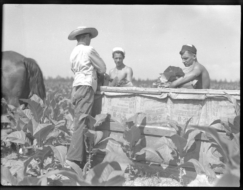 Récolte du tabac jaune à Lanoraie, 1942, Archives nationales à Québec, Fonds Ministère de la Culture et des Communications, (03Q,E6,S7,SS1,D2,P4296), Omer Beaudoin.