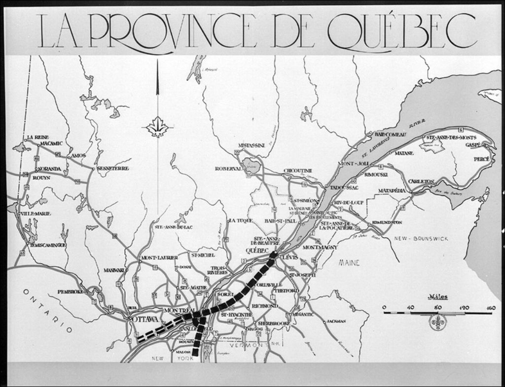 Carte des autostrades de la Province, 1941, Archives nationales à Québec, Fonds Ministère de la Culture et des Communications, (03Q,E6,S7,SS1,D2,P4361), Jean Langevin.