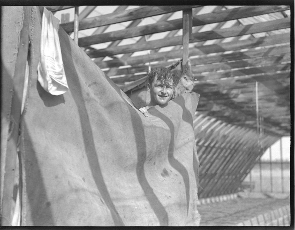 La douche après le travail à Lanoraie. Après les récoltes, on réutilise l'eau, chauffée par le soleil, des réservoirs des serres.