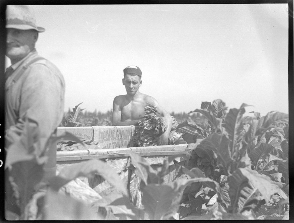 Feuilles de tabac au poste d'attachage à Lanoraie