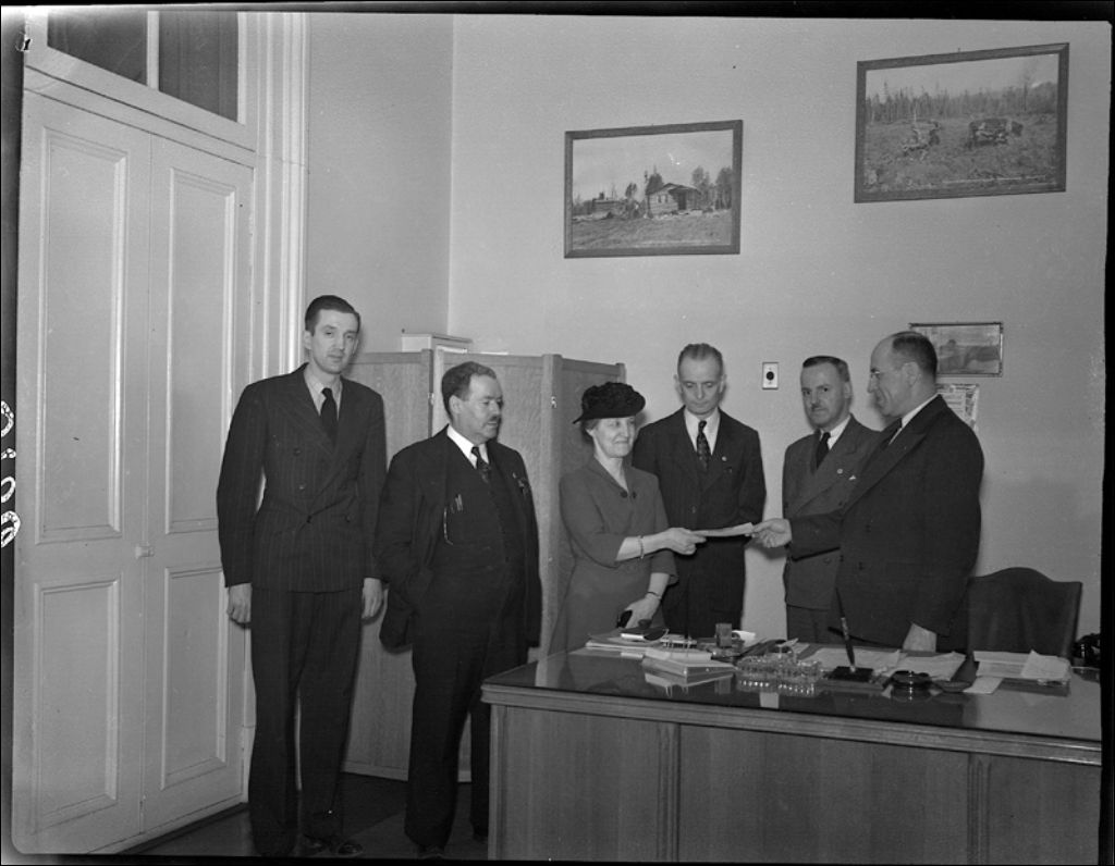 Le ministre Brown donne un chèque à mademoiselle Bédard. De droite à gauche : M. Brown, R. Nadeau, T. Mercier, Mlle Bédard, J.E. Garon, Robert Greffard