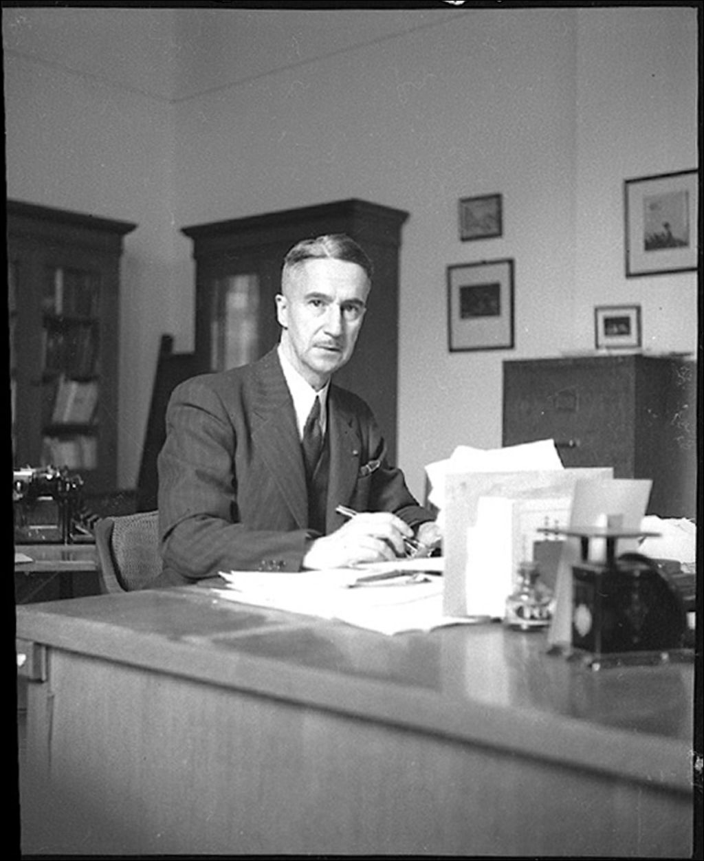 Maurice Hébert du Bureau de Tourisme à son bureau, 1941, Archives nationales à Québec, Fonds Ministère de la Culture et des Communications, (03Q,E6,S7,SS1,D2,P5616), Herménégilde Lavoie.