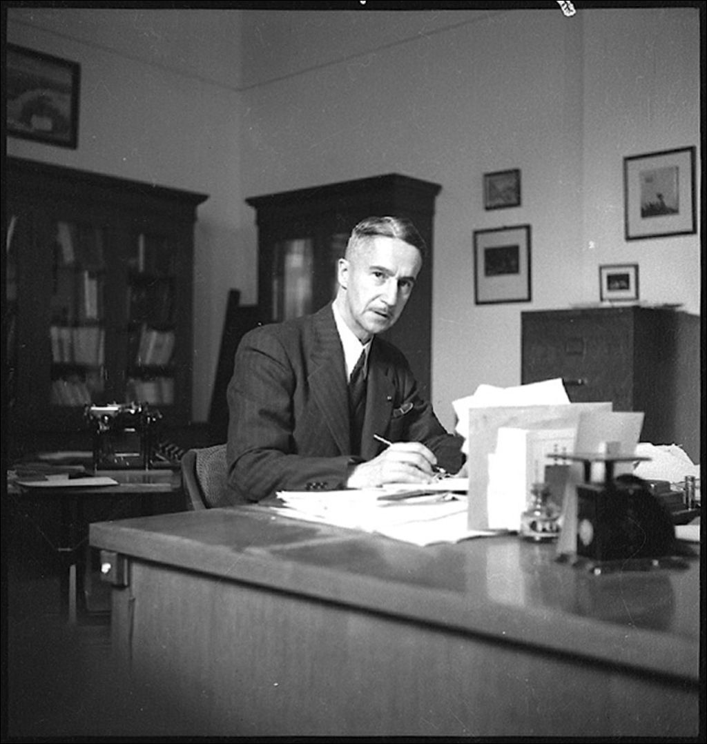 Maurice Hébert du Bureau de Tourisme à son bureau, 1941, Archives nationales à Québec, Fonds Ministère de la Culture et des Communications, (03Q,E6,S7,SS1,D2,P5617), Herménégilde Lavoie.