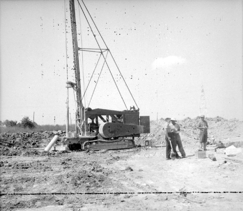 Perforeuse à l'oeuvre dans la carrière de Melocheville, comté de Beauharnois, 1947, Archives nationales à Québec, Fonds Ministère de la Culture et des Communications, (03Q,E6,S7,SS1,D2,P60213), A. Mailloux.