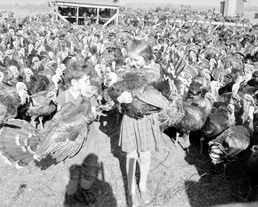 Troupeau de 2 600 dindes sur la ferme de R. Vadnais à Wickham, 1947, Archives nationales à Québec, Fonds Ministère de la Culture et des Communications, (03Q,E6,S7,SS1,D2,P60283), Omer Beaudoin.